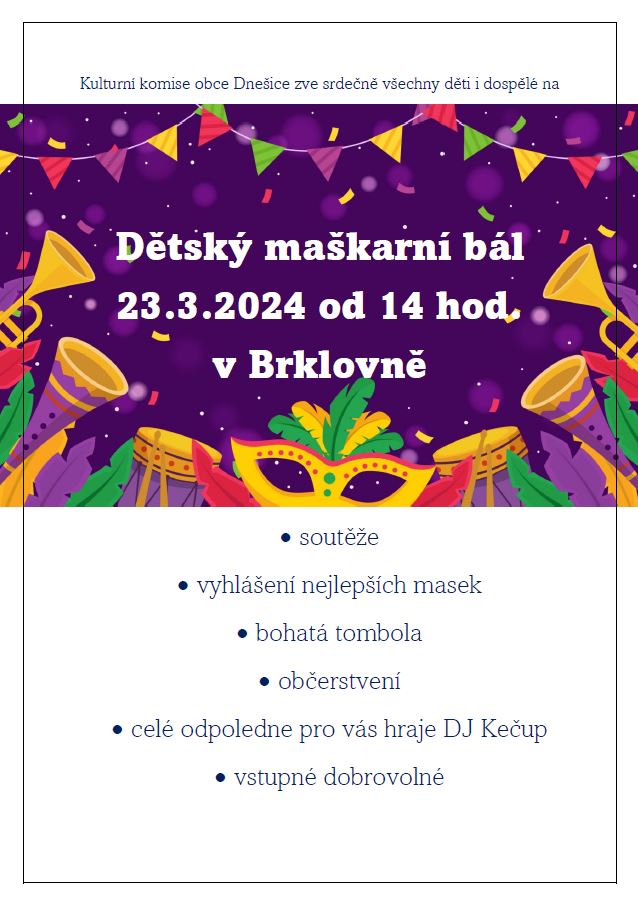 Kulturní komise obce Dnešice zve srdečně všechny děti i dospělé na Dětský maškarní bál 23.3.2024 od 14 hod. v Brklovně v Dnešicích.