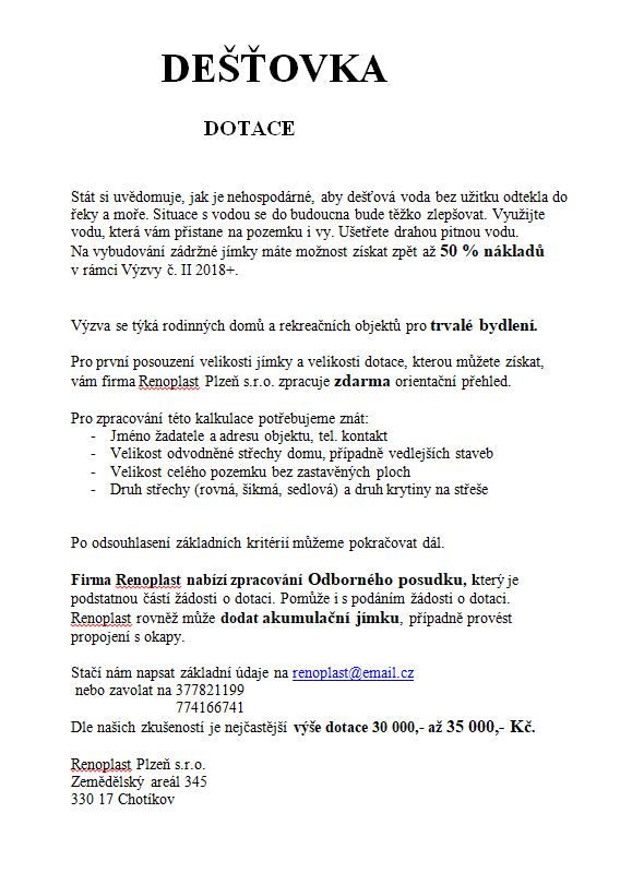 Pro první posouzení velikosti jímky a velikosti dotace, kterou můžete získat, vám firma Renoplast Plzeň s.r.o. zpracuje zdarma orientační přehled.