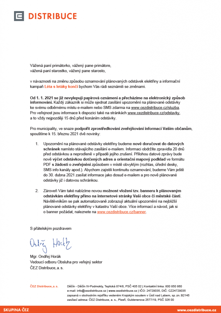 - Upozornění na plánované odstávky elektřiny budeme nově doručovat do datových schránek namísto stávajícího zasílání e-mailem. Informaci obdržíte zpravidla 20 dnů před odstávkou a neprodleně v případě jejího zrušení. Přílohou datové zprávy bude nově výčet odstávkou dotčených adres a orientační mapový podklad ve formátu PDF s žádostí o zveřejnění způsobem v místě obvyklým (rozhlas, úřední desky, SMS info kanály apod.). Abychom zajistili kontinuitu oznamování, budeme Vám ještědo 30. dubna 2021 zasílat informace jako dosud e-mailem a pro nově plánované odstávky již i datovou schránkou.