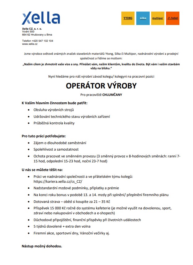 Nabídka pracovního místa v Xella CZ s.r.o. v Chlumčanech.