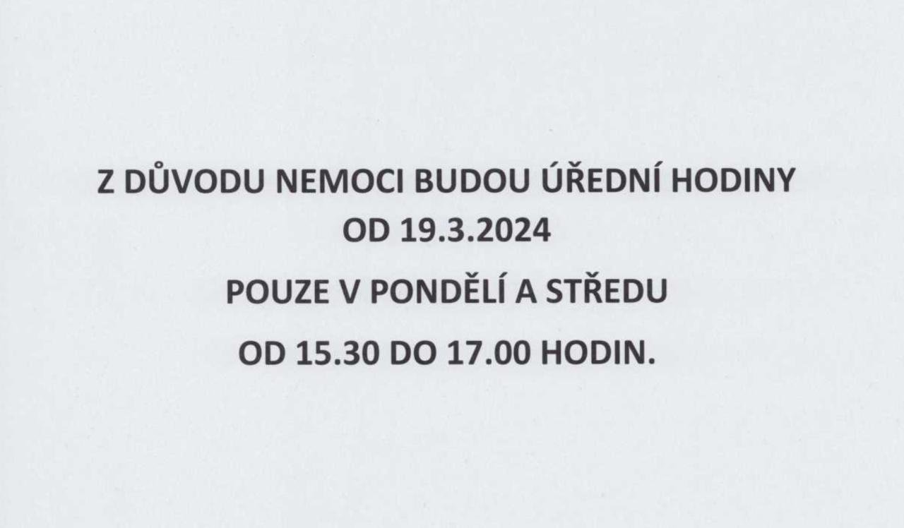 PO: 7:00-12:00 12:30-15:30 (úřední den) 15:30-17:00 starosta, místostarosta