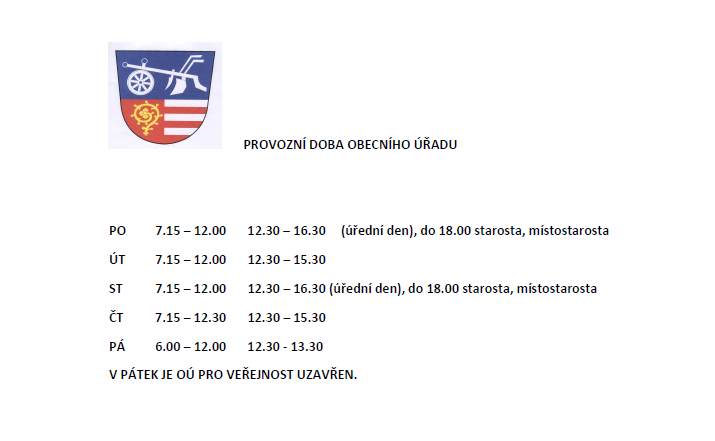 - PO 7.15 – 12.00 12.30 – 16.30 (úřední den), do 18.00 starosta, místostarosta