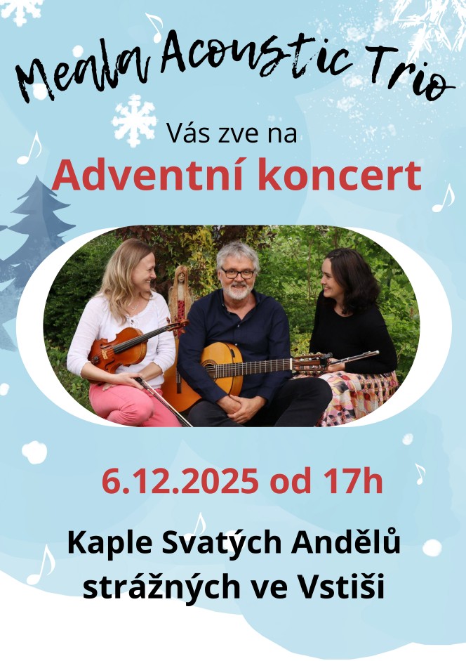 Zveme vás na druhý adventní koncert, který se uskuteční v kapli svatých andělů strážných ve Vstiši. Koncert se bude konat 6. prosince 2025 od 17:00. Vystoupení Meala Acoustic Trio slibuje příjemný zážitek v krásném prostředí kaple, kde si můžete vychutnat vánoční atmosféru a hudbu. Přijďte strávit večer plný hudby a radosti s námi.