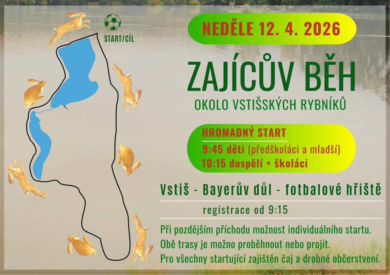 Zajícův běh okolo Vstišských rybníků se koná v neděli 12. dubna 2026. Start z fotbalového hřiště. Registrace začíná v 9:15 a pro účastníky je připravena možnost individuálního startu v případě pozdního příchodu. Akce je otevřená pro všechny, kteří si chtějí vyzkoušet běh nebo procházku po dvou trasách, které jsou k dispozici. Pro účastníky bude připravený čaj a drobné občerstvení.